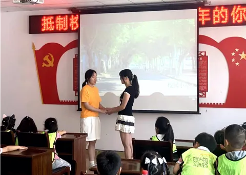 入党积极分子陈青青同学在模拟法庭后开展了反对校园霸凌的主题演讲,带领小朋友们庄严宣誓,引导小朋友们将抵制校园霸凌、勇敢保护自己的意识内化于心、外化于行。