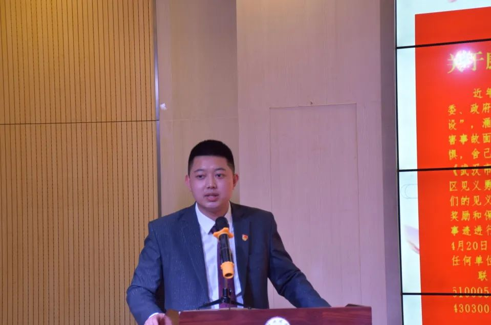 赵学迅老师致辞,心有榜样、行有方向。正值五四青年节之际,青春当以奋斗为之不懈。武汉文理公司党委副书记赵学迅老师以弘扬见义勇为精神为引导,鼓励大家学习先进典型榜样,转递青春正能量。风华正茂历百年,继往开来二十载。当代青年人与时代同向同行,每位青年学子都当努力奋进,不负韶华,跟紧党的步伐,积极学习党史,从党史中学习先进精神,赋青春以力量。