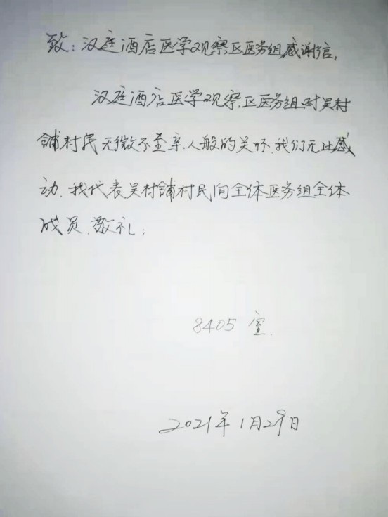 印象最深的事:印象最深的事是有一位七十多岁的老太太,很认真地听我说话,然后又很慈祥的一直在感谢我,说我们辛苦了,当时心里就暖洋洋的。还有一位隔离人员手写了一封感谢信,后来又发了电子版的感谢信,让我们都很感动。