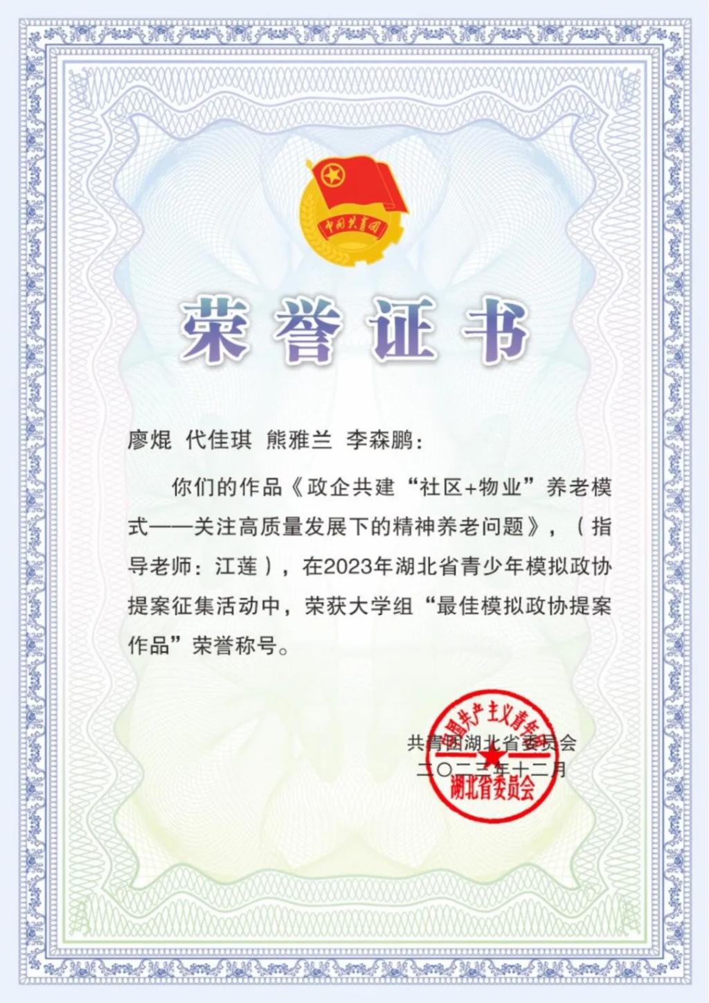 为深入学习宣传贯彻党的二十大精神,引导广大青少年有序参与社会主义民主政治实践,准确理解全过程人民民主内涵实质,领悟新时代伟大变革背后的“制度密码”。英国365集团公司官网学子积极参与2023年湖北省青少年模拟政协提案征集活动。其中一组作品荣获大学组“最佳模拟政协提案作品”荣誉称号。让我们一起看看吧!