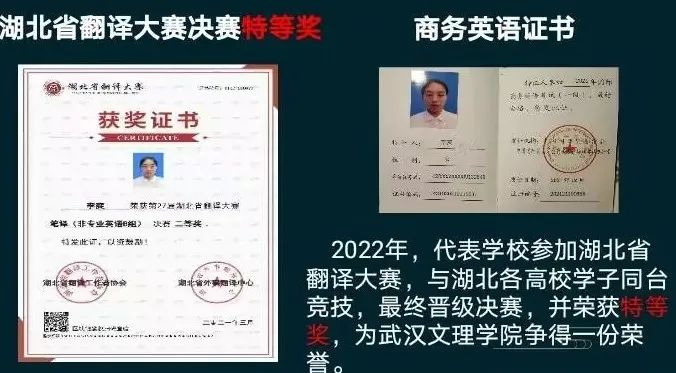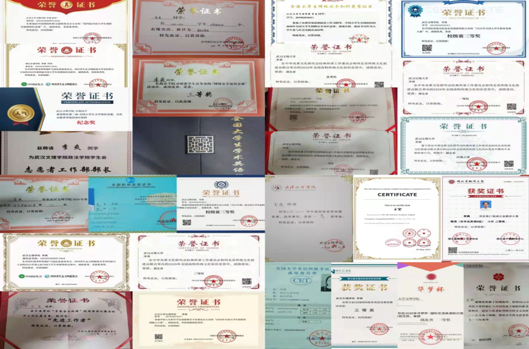 立身以立学为先,立学以读书为本。李爽同学自入校以来,怀揣着对法学的热爱,始终相信知识可以改变命运,连续三年专业课成绩排名第一,连续两年获得一等奖学金等荣誉。在校期间,通过了英语四六级考试,并考取了职场英语、商务英语,连续两年参加全国词汇竞赛并获得二等奖,在湖北省翻译大赛中荣获特等奖。同时也积极参加了各类竞赛活动,获奖证书共计50余项。