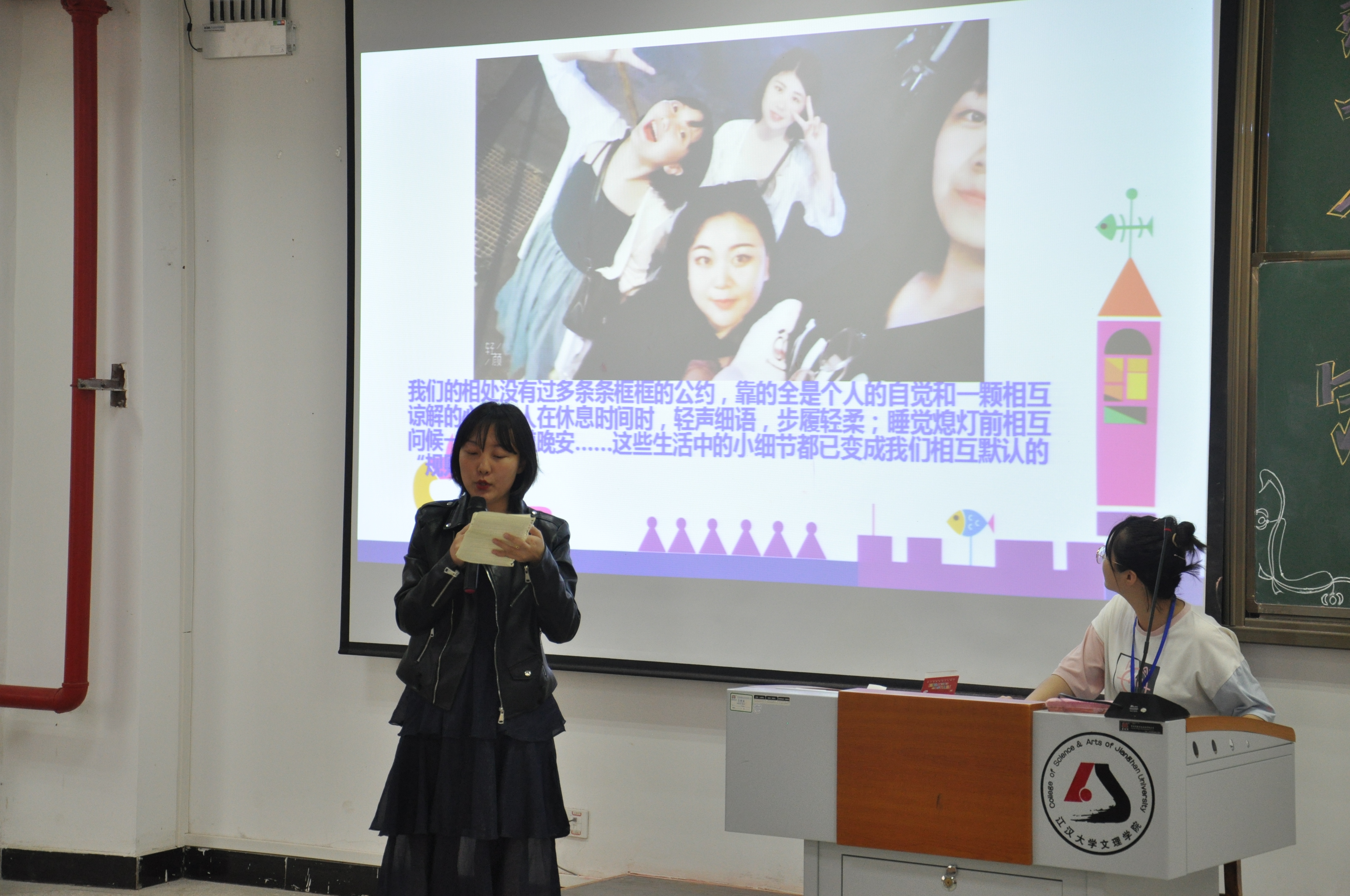 休息过后,上场演讲的是竞选优秀寝室的15-2632和14-2219,前者是将宿舍整体,室友关系做了详细的讲解,让大家充分认识到她们;后者则是将宿舍比作魔仙堡,介绍了魔仙堡的四位小魔仙及其她们的日常,在结束演讲之后还合唱了《巴啦啦小魔仙》主题曲。随后主持人公布了双方的代表色并进行投票统计。最后一组上场演讲的是竞选文明寝室15-2609以及八个宿舍中唯一的男寝13-1304。两者介绍完后主持人公布双方代表色并进行投票。