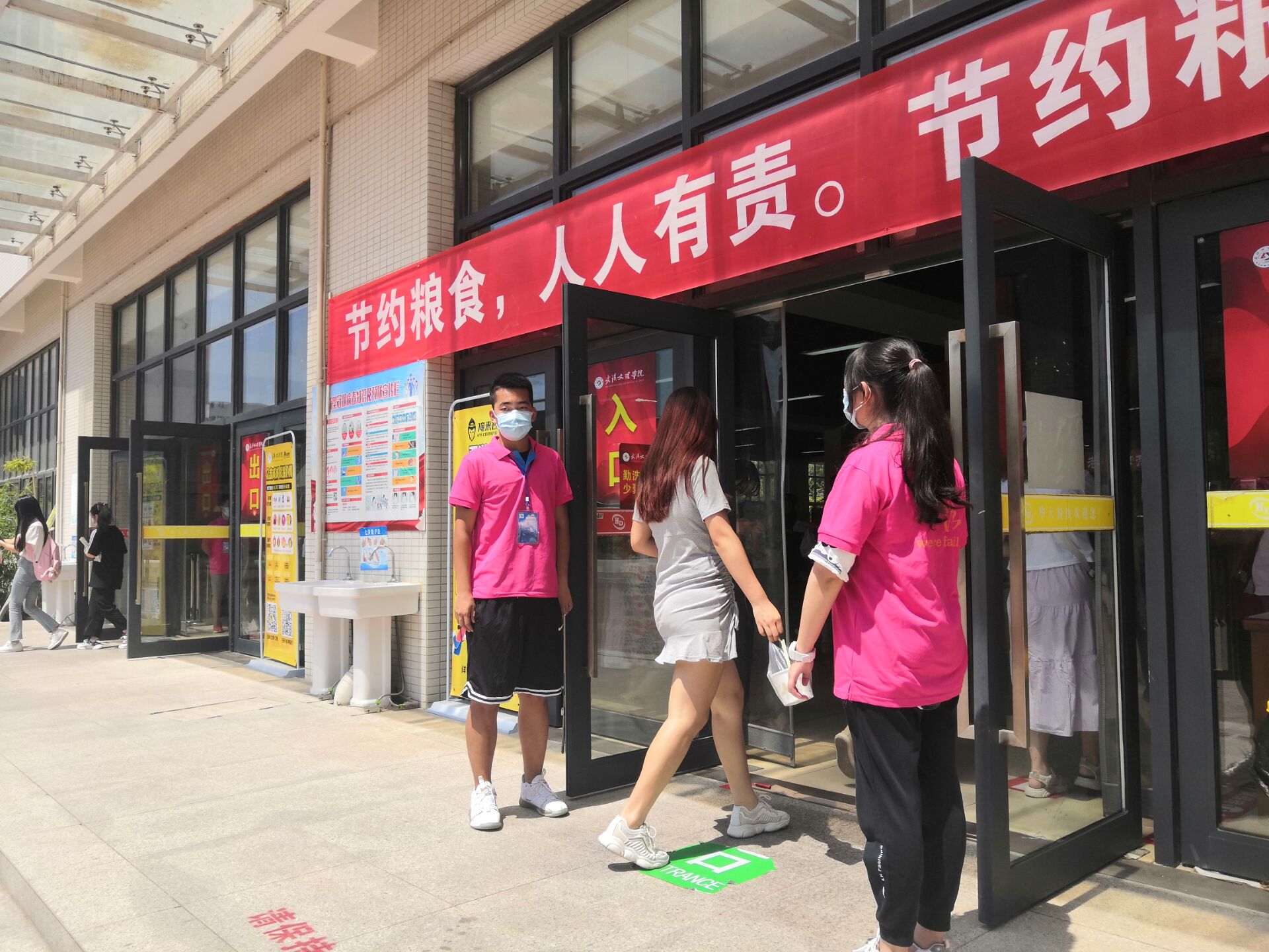 正值饭点,食堂外人头攒动,几位值班的员工干部守在老食堂的出入口。他们提醒同学们佩戴好口罩,保持1.5米安全距离,有序进入食堂就餐,引导他们从正确的出入口进出食堂。值得高兴的是, 经过此次“文明食堂”活动的开展,员工佩戴口罩进入食堂的现象得到了很大的改善,并且绝大多数的同学选择打包带回寝室就餐,自觉地从正确的出入口进出食堂。这说明此次“文明食堂”活动的开展是有相当成效的,同时也表明同学们的防疫思想意识也在不断进步。
