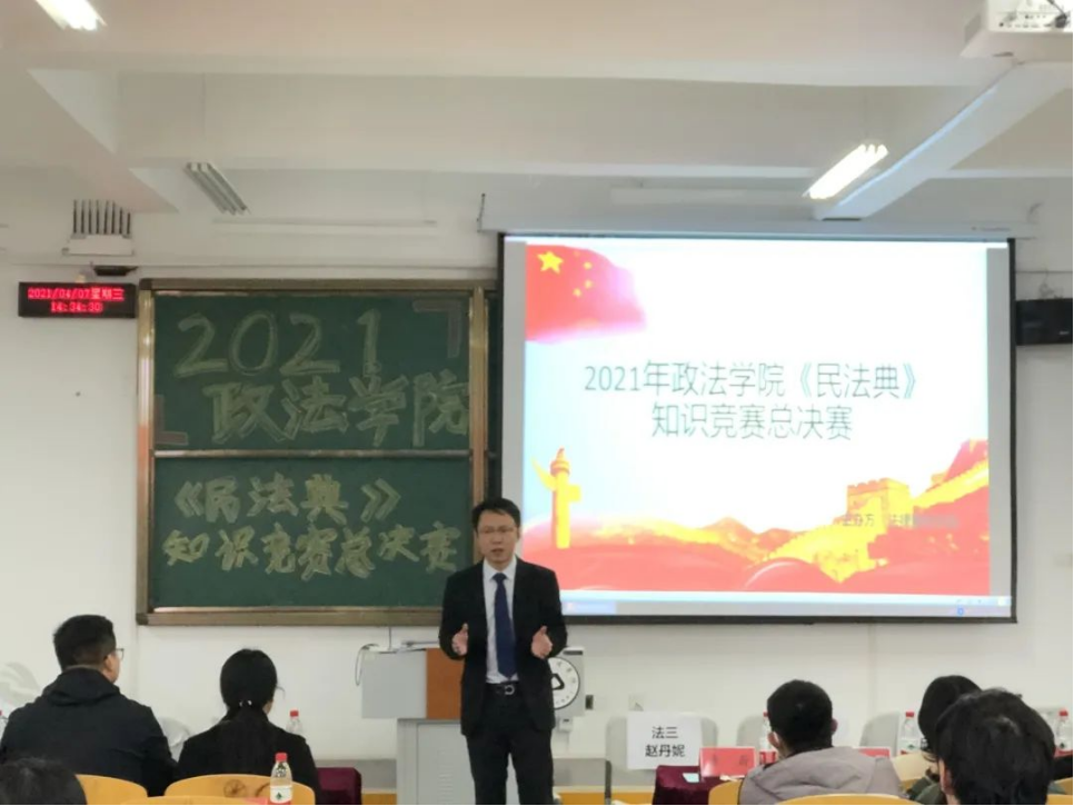 随着老师、比赛选手、以及同学们的入场。比赛也渐渐拉开了帷幕。来观看这次竞赛的老师们可谓是“天团阵容”,有我们的经理李蔚老师,副经理陈海峰老师、曾鹏老师、法学系主任张卫容老师以及各科的任课老师。可谓是来了一场小型的“聚会”。这也体现了老师们对这次决赛的重视与支持。李蔚老师在致词中也表示了自己对民法典的学习体会和对学子们在今后的学习生活的期望。也希望以后有更多这样类似的比赛来激发同学们的热情。