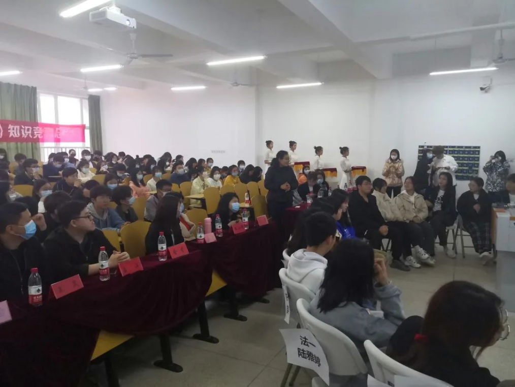 在主持人介绍了比赛的流程及要求和来参观的老师之后,比赛正式开始,这次比赛采取团体战模式。选手们依次抽签,分为五个小组并选择所挑选的题组来进行答题。答对加分,答错或超时不得分。当主持人宣布:第一组开始了!选手们都看向屏幕,看着出来的一道道题目。大脑正在飞速的运转着。几个呼吸的瞬间,答题选手走上了讲台。自信的说出自己的答案。当看见正确答案与自己一致时,现场一片掌声。偶尔也有自己不确定拿不准的题目。小组之间互相商量,最终得出答案。即使发错了也不气馁,继续进行“头脑风暴”。就这样,五个小组的基础比拼就结束了。表现得不分伯仲,接下来便是比赛的白热化阶段了。