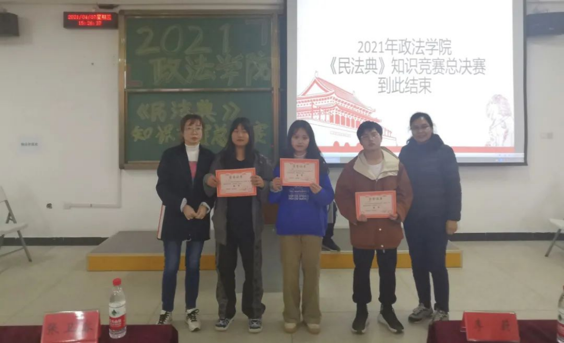 根据选手们的表现,成绩也相继出来,竟然出现了两个小组同分的情况。最后由老师一道题目,由两个小组抢答,以此来决定冠军将花落谁家。由于第二组的选手回答错误,因此第三组获得了这次比赛的第一名。接着各个小组依次上台领奖。由老师为获胜选手颁奖,并拍照留念。最后是全体参赛人员和老师门共同合影留念。获奖选手的脸上都洋溢着自信开心的笑容。就这样,在掌声和音乐中,民法知识竞赛总决赛完美落幕。