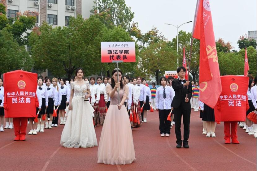 运动会开幕式,升国旗、奏国歌时嘹亮的声音响彻整个田径场,啦啦队、图案舞、跆拳道展示、舞龙舞狮表演、团体舞、彩球队以及各公司方阵,他们迈着整齐的步伐,昂首阔步,在主席台前一展雄姿。且看英国365集团公司官网方阵,学子们的步伐铿锵有力,雄赳赳气昂昂,礼仪队员手持天秤,展现了政法学子对公平正义的追求。