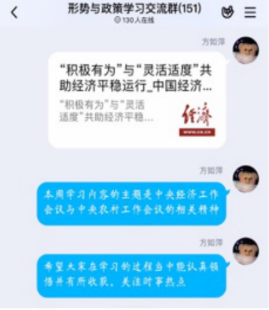 方如萍深感作为“形势与政策”课教师上好抗疫第一课的重要性,在老家没有电脑,没带教材的不便条件下,利用一部网络信号并不好的手机收集了大量的图片、文字、视频资料与员工分享抗疫过程的真善美,并将该门课程的第一个专题“2019年中央经济工作会议及中央农村工作会议解读”与抗疫期政府对恢复经济平稳运行的宏观支持政策有机结合起来,让员工们切实感受到我国精准扶贫的“一个不能少”和抗击新冠疫情的“一个患者不漏掉的”的“人民至上”的治国理念。